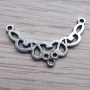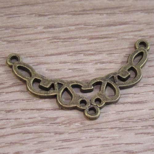 Dit metalen element heeft drie bevestigingsogen. Eén aan beide uiteinden en één in de punt in het midden. Kan als middenstuk van een ketting of in oorbellen gebruikt worden, waarbij aan de punt nog bijvoorbeeld een druppelvormige glaskraal gehangen kan worden.