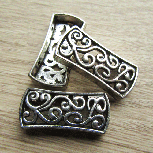 • Maat: 25 x 12 x 4 mm.• Per 3 stuks.Kraal verdeler twee ogenMooi element opengewerkt met krullen. Dit is een onderdeel dat je kunt gebruiken wanneer je een sieraad maakt met meerdere strengen. Deze verdeler heeft twee rijggaten, voor twee rijen of strengen dus. Leuk om een dubbele armband mee te maken. Hieronder een ketting, waarbij de verdeler gebruikt is om van 1 naar 3 strengen te gaan.