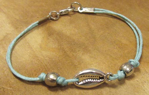 Knip twee stukjes waxkoord van ca. 25 cm. Je kunt hiermee ook handig restjes waxkoord opmaken. Rijg het koord door het oogje van de schelpbedel en vouw dubbel. Leg een knoop in het koord. Rijg een buiskraal over twee draden en leg nog een knoop. Rijg aan de andere kant het waxkoord door de opening in de bedel en vouw dubbel. Doe verder hetzelfde als aan de andere kant.