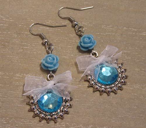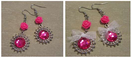 Het leuke van sieraden maken is, dat de mogelijkheden zo groot zijn. Vind je de strikjes te zoet? De oorbellen zijn ook erg leuk zonder. Een andere kleur mooier, of liever een combinatie van kleuren. Het kan allemaal. De imitatie stras plakstenen kun je vervangen door glascabochons van 12 mm waar je je eigen foto achter plakt.
