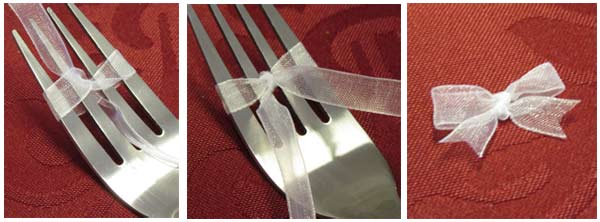 Hiervoor knip je een stukje organza lint van ca. 15-20 cm lang. Pak een vork. Vouw het lint rond de vork. Haal een uiteinde van het lint onder het lint door tussen de middelste tanden van de vork. Haal het boven het lint weer tussen de middelste tanden door en knoop stevig vast met het andere uiteinde. Knip de uiteinden schuin in om rafelen te voorkomen. Doe een flinke druppel sieradenlijm op de achterkant van de knoop en plak de strik net boven de plaksteen. Hou een tijdje vast. Het lint zuigt de lijm op, het kan soms nodig zijn een extra druppeltje lijm te gebruiken om de strik goed vast te plakken.
